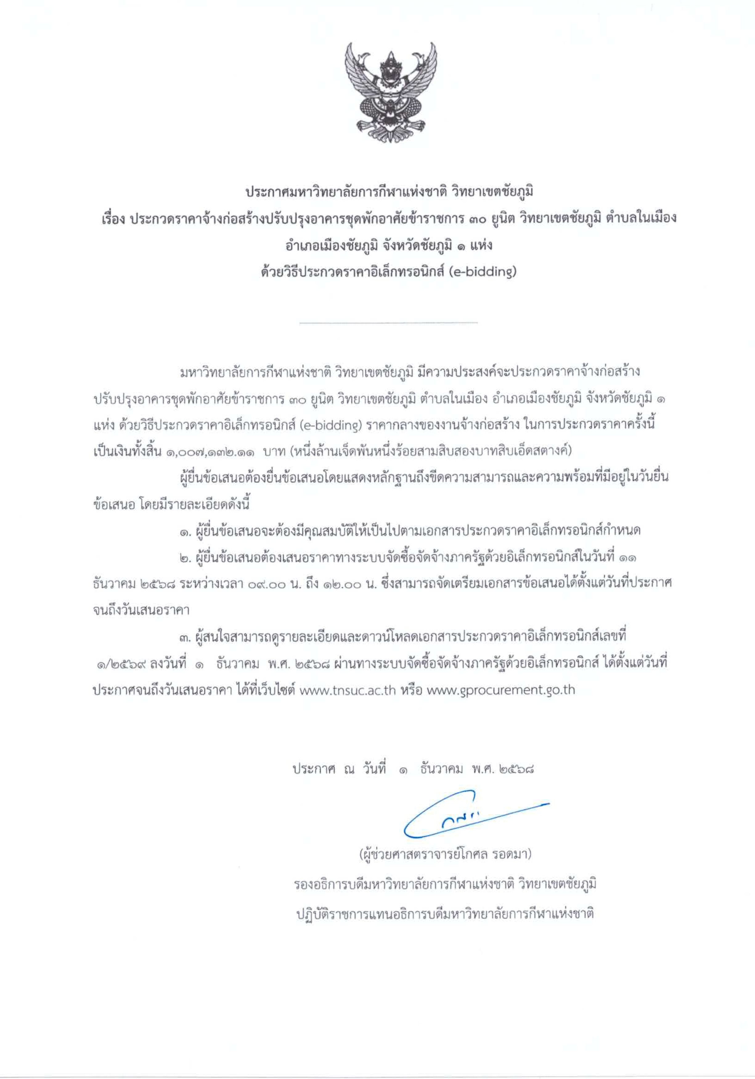 ประกาศ ประกวดราคาจ้างก่อสร้างปรับปรุงอาคารชุดพักอาศัยข้าราชการ 30 ยูนิต