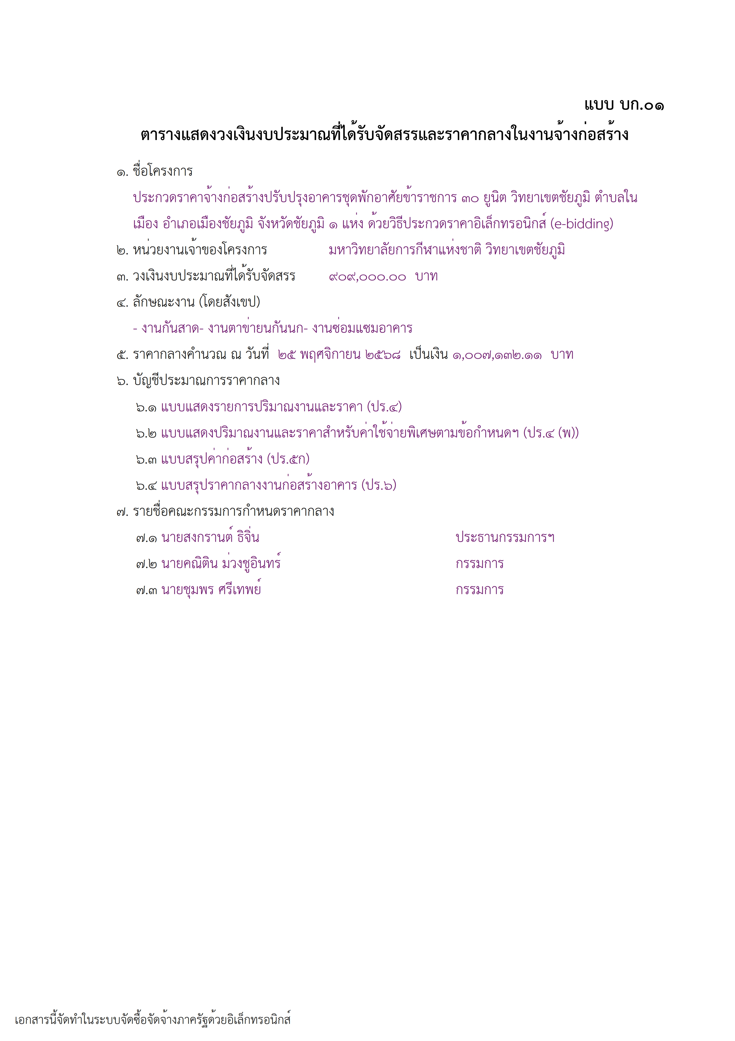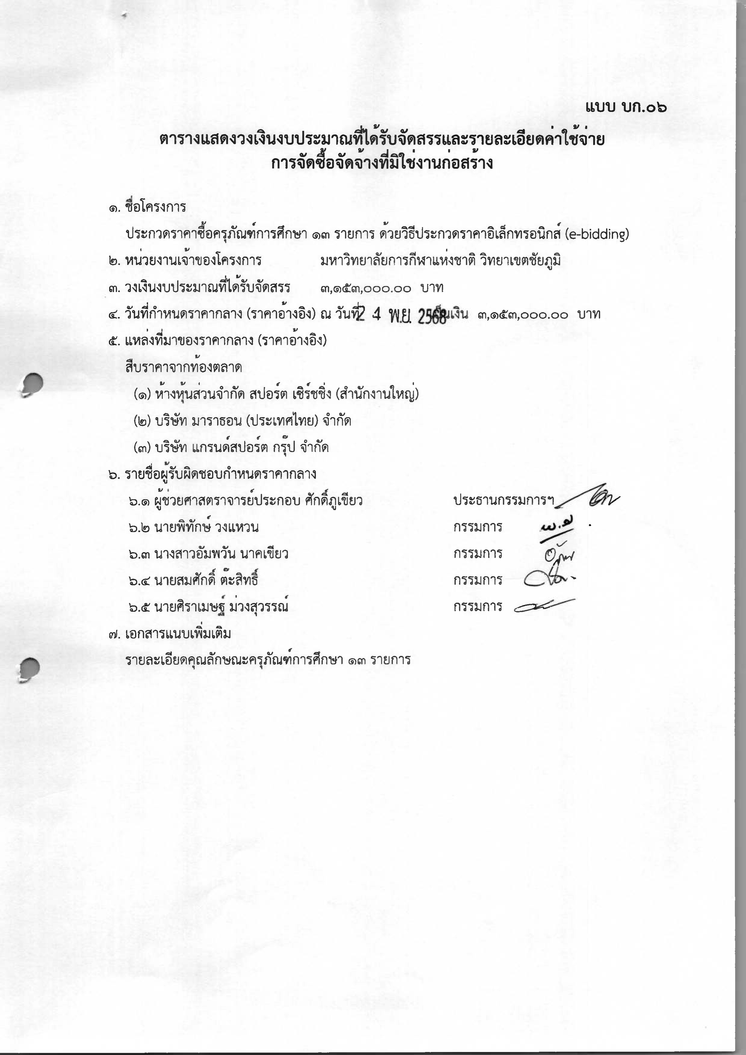 ประกาศ ตารางแสดงวงเงินงบประมาณที่ได้รับจัดสรรและรายละเอียดค่าใช้จ่าย การจัดซื้อจัดจ้างที่มิใช่งานก่อสร้าง (แบบ บก.06)